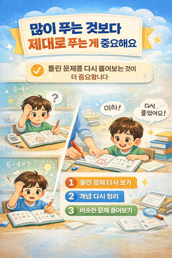 마지막으로 중요한 기준은 오답을 다시 볼 수 있는지입니다. 실제로 실력 차이는 문제를 몇 권 풀었는지보다 틀린 문제를 어떻게 다루는지에서 벌어지는 경우가 많습니다. 많이 풀었지만 같은 실수를 반복하는 아이가 있는 반면, 권수는 많지 않아도 틀린 문제를 꼼꼼히 돌아보며 성장하는 아이도 있습니다. 그래서 저는 문제집을 고를 때 해설의 구조나 복습 동선도 함께 봅니다. 틀렸을 때 다시 생각해 볼 여지가 있는 책인지, 아이가 오답을 통해 배울 수 있게 설계된 책인지를 확인하는 것입니다.